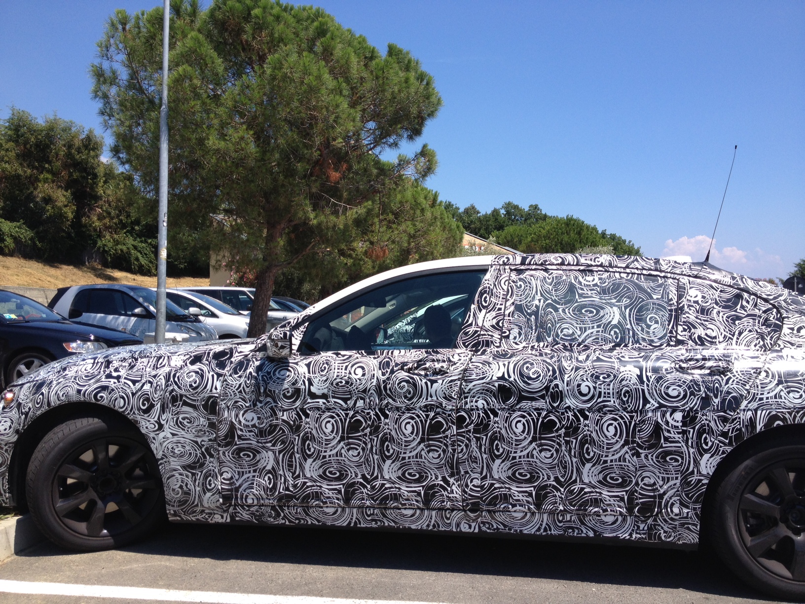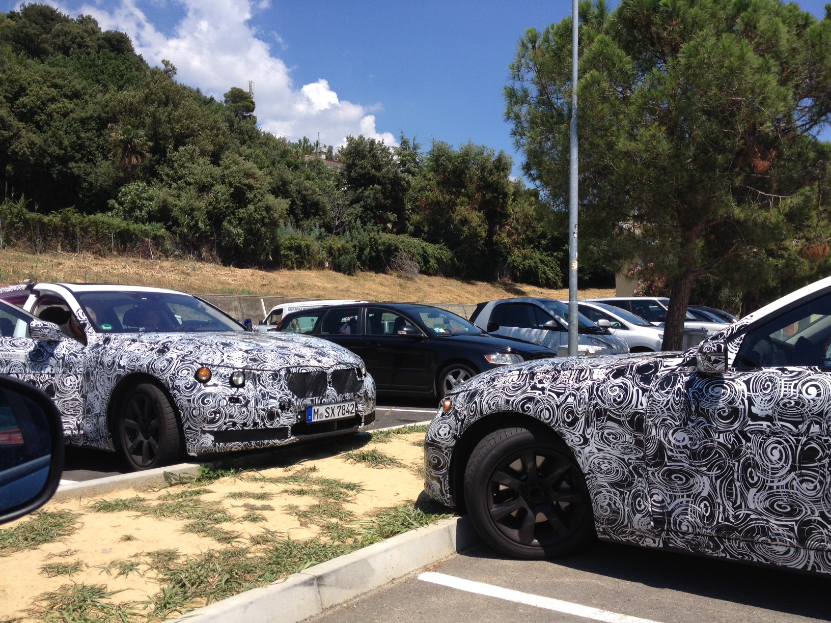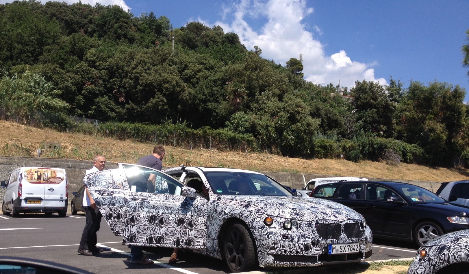Avvicinandosi meglio, approfittando della loro sosta in un’area di servizio, si nota che anche interni e dettagli sono top-secret: il feltro nasconde cruscotto e volante mentre non c’è ombra di loghi o stemmi ad indicare la casa automobilistica, nemmeno sul cofano.