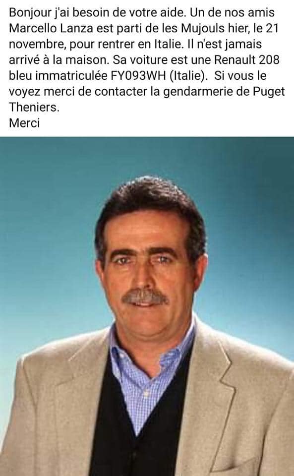 Secondo quanto ricostruito, Lanza, lo scorso 21 novembre, sarebbe partito a bordo della sua Renault 208 blu (targa FY093WH) da Les Mujouls, un paese della Provenza, per rientrare in Italia. L’ex Sindaco di Triora, però, non ha più fatto rientro a casa e di lui si sono perse le tracce.