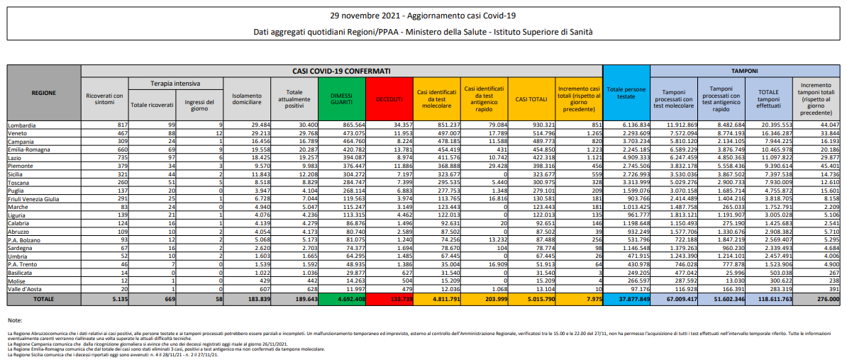276.000 i tamponi effettuati, con un tasso di positività al 2,9%. Nelle ultime 24 ore, si sono registrati 65 morti.