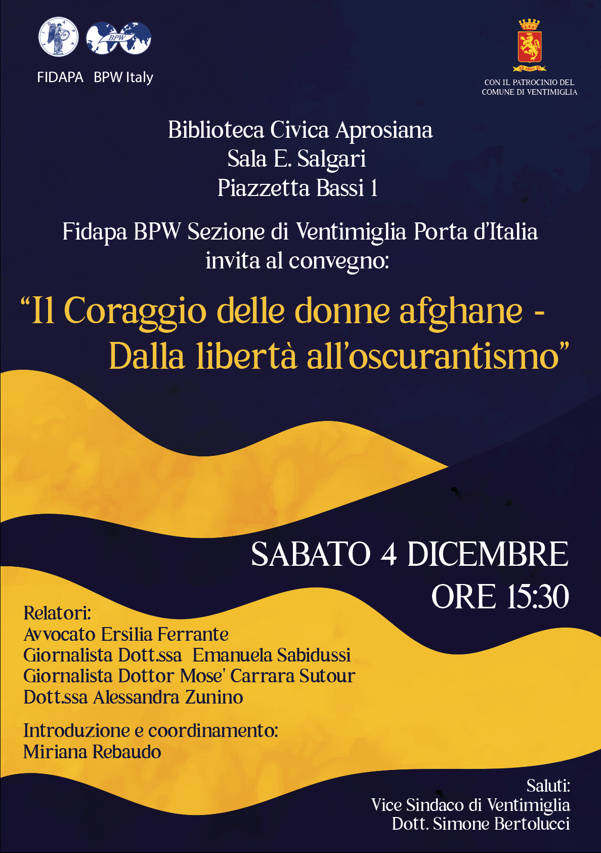 Fidapa BPW Sezione di Ventimiglia Porta d’Italia ha organizzato il Convegno dal titolo “Il coraggio delle donne afghane: dalla libertà all’oscurantismo” che si terrà questo sabato 4 dicembre 2021 alle ore 15:30 presso la Biblioteca Civica Aprosiana di Ventimiglia sita nella Piazzetta Bassi, Sala E. Salgari.