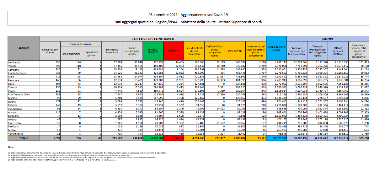 In totale sono 22 le persone attualmente in terapia intensiva, di queste 21 non sono vaccinate.