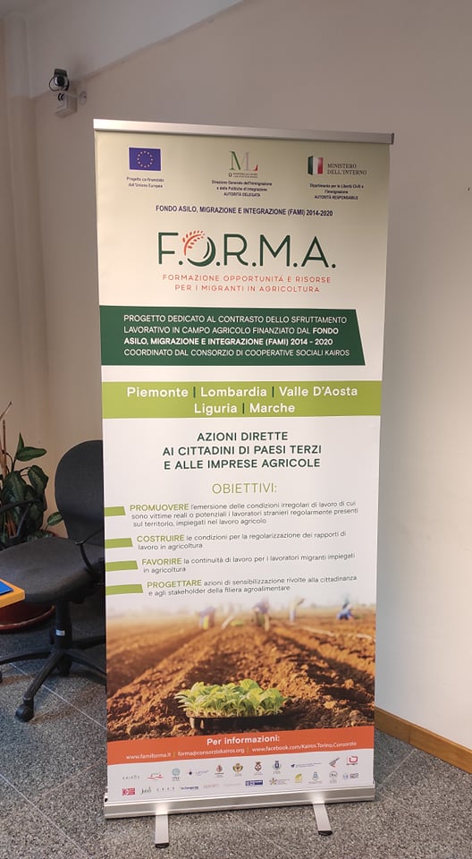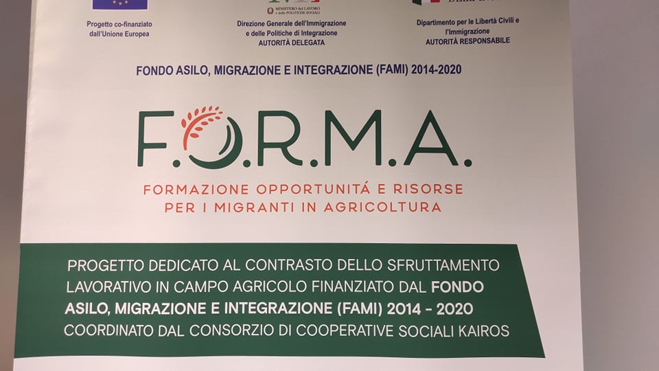 Il progetto F.O.R.M.A – Formazione Opportunità e Risorse per Migranti in Agricoltura è finanziato dal Fondo Asilo, Migrazione e Integrazione 2014-2020 – Progetti per la Prevenzione e il Contrasto dello Sfruttamento Lavorativo in Agricoltura e coordinato dal Consorzio di Cooperative sociali KAIROS.