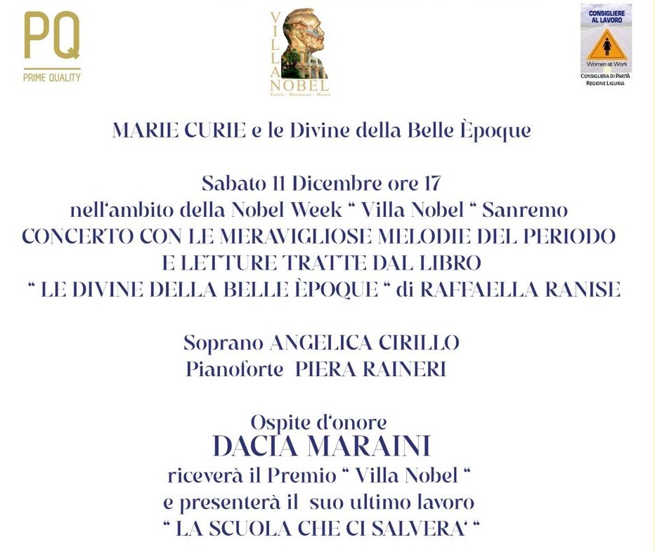 Presente in sala l’ospite d’onore Dacia Maraini, alla quale al termine del concerto è stato consegnato il Premio Villa Nobel realizzato dallo studio di design di Giovanna Locatelli (Lecco). L’evento è stato patrocinato dall’Ufficio Consigliera di Parità di Regione Liguria ed erano presenti la Consigliera effettiva Laura Amoretti e la Consigliera supplente Irene Mercuri.