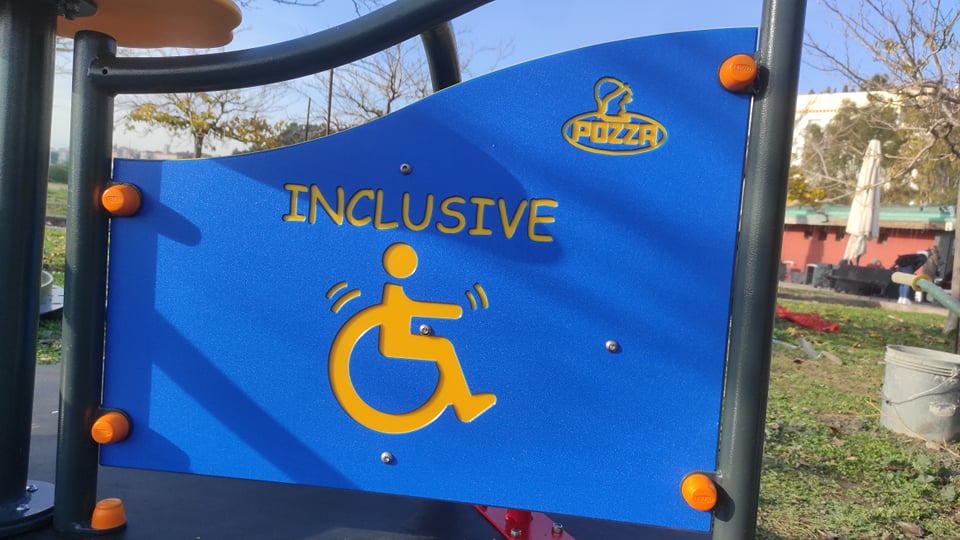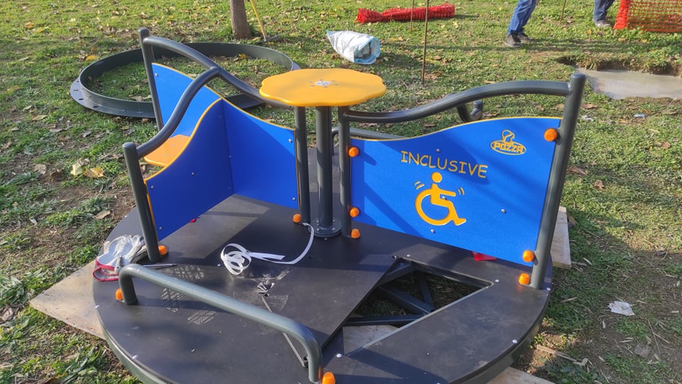 Il primo gioco è arrivato, lo stanno montando oggi. È una giostra inclusiva, una giostra rotonda dove i ragazzi in sedia a rotelle possono giocare insieme ai ragazzi normodotati.