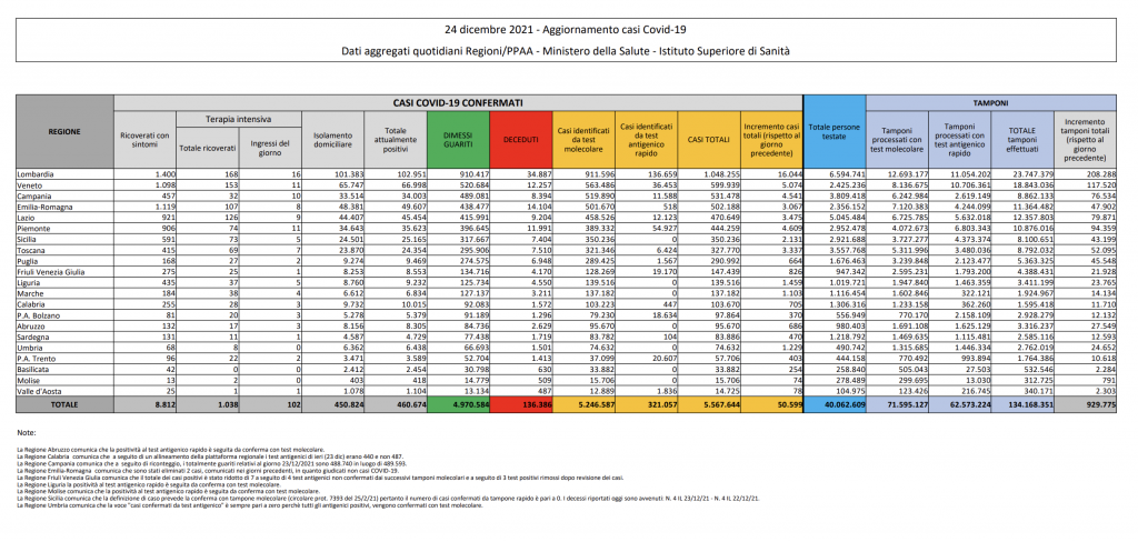 Covid, Italia: il bollettino di venerdì 24 dicembre