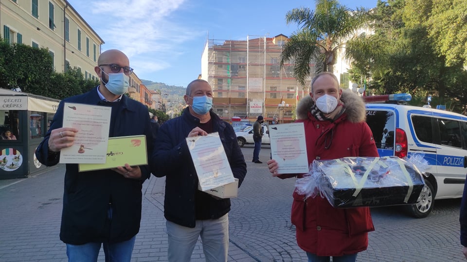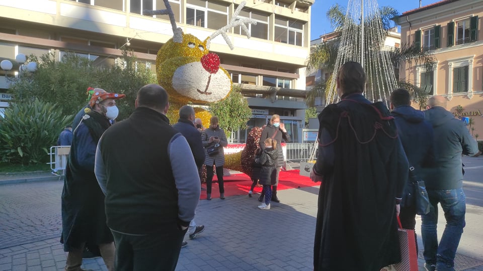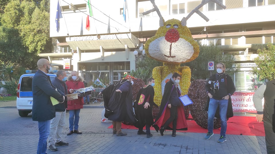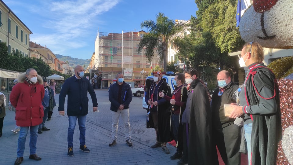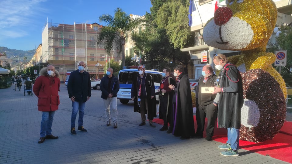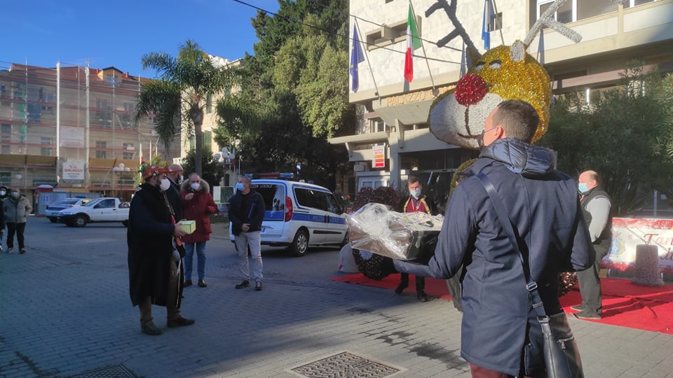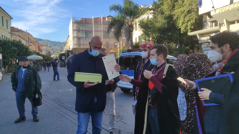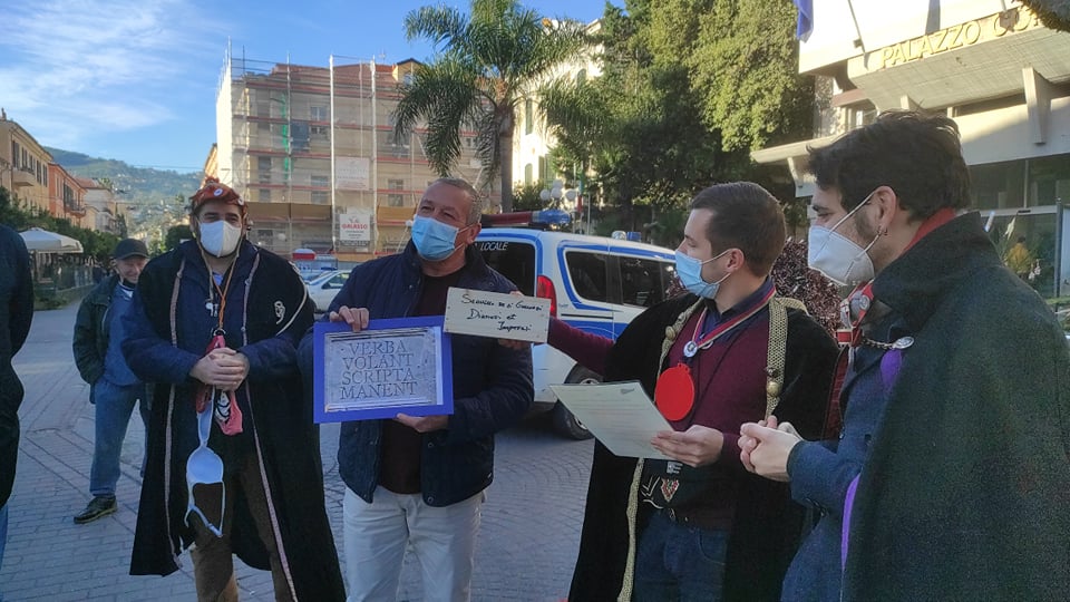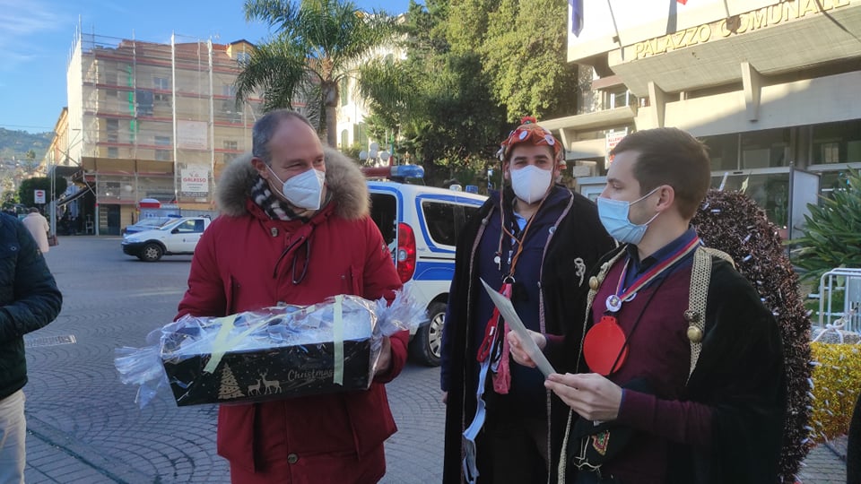 Simpatica iniziativa questa mattina, venerdì 7 gennaio, a Diano Marina, di fronte al palazzo comunale. I Goliardi dianesi hanno voluto omaggiare, con dei regali stravaganti, alcuni amministratori che hanno accettato di partecipare al loro gioco.