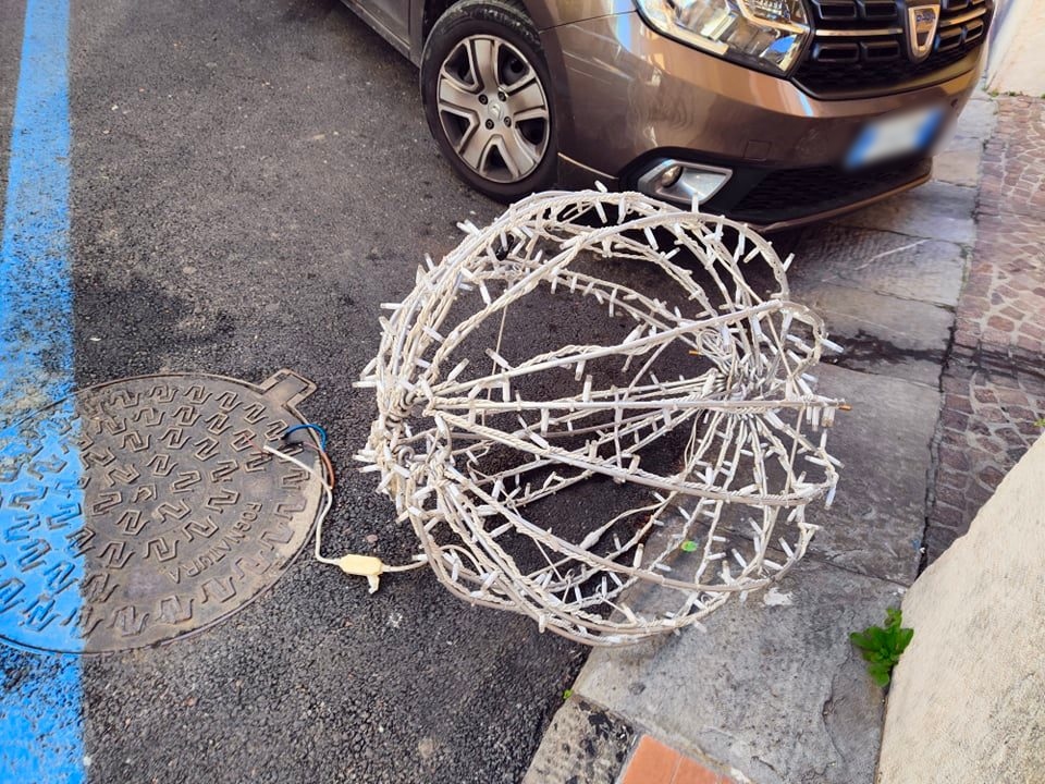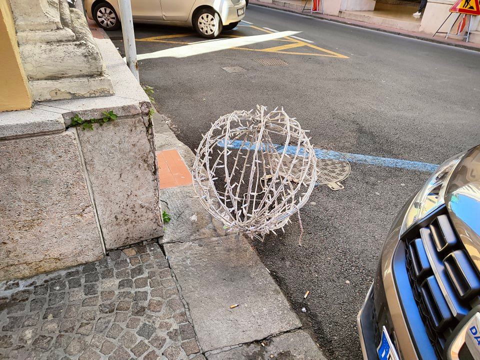 Incidente per fortuna senza particolari conseguenze, nella mattinata di oggi in via Bonfante a Oneglia. Una luminaria natalizia, a forma di sfera, probabilmente a causa di una folata di vento forte, si è staccata ed è caduta a terra.