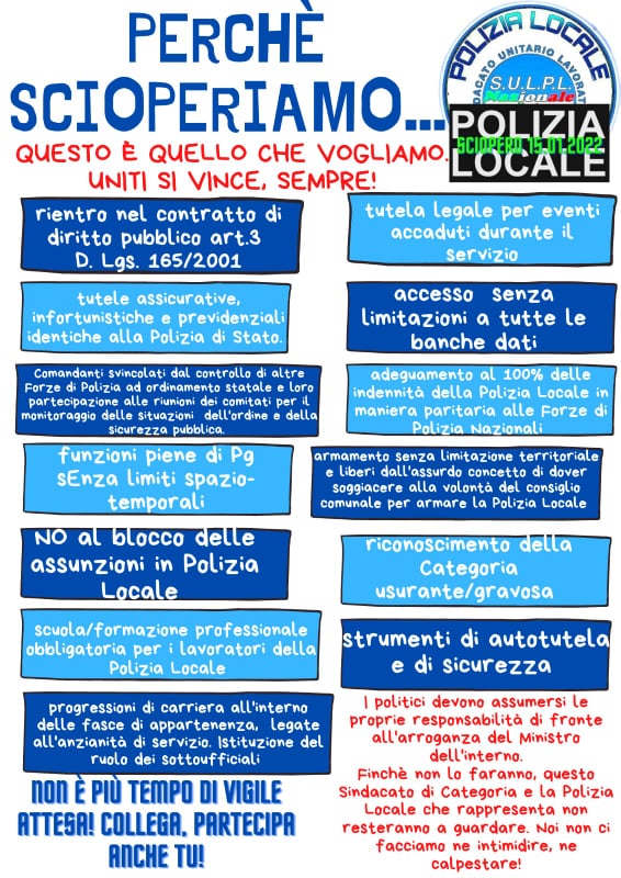 Le nostre richieste sono un contratto di natura pubblica, basti pensare che noi siamo inquadrati contrattualmente come impiegati comunali, il riconoscimento di categoria gravosa e usurante perchè svolgiamo quotidianamente le stesse funzioni delle forze dell’ordine dello Stato, che ringraziamo perchè sono qua davanti a noi e stanno manifestando la loro solidarietà nei nostri confronti”.