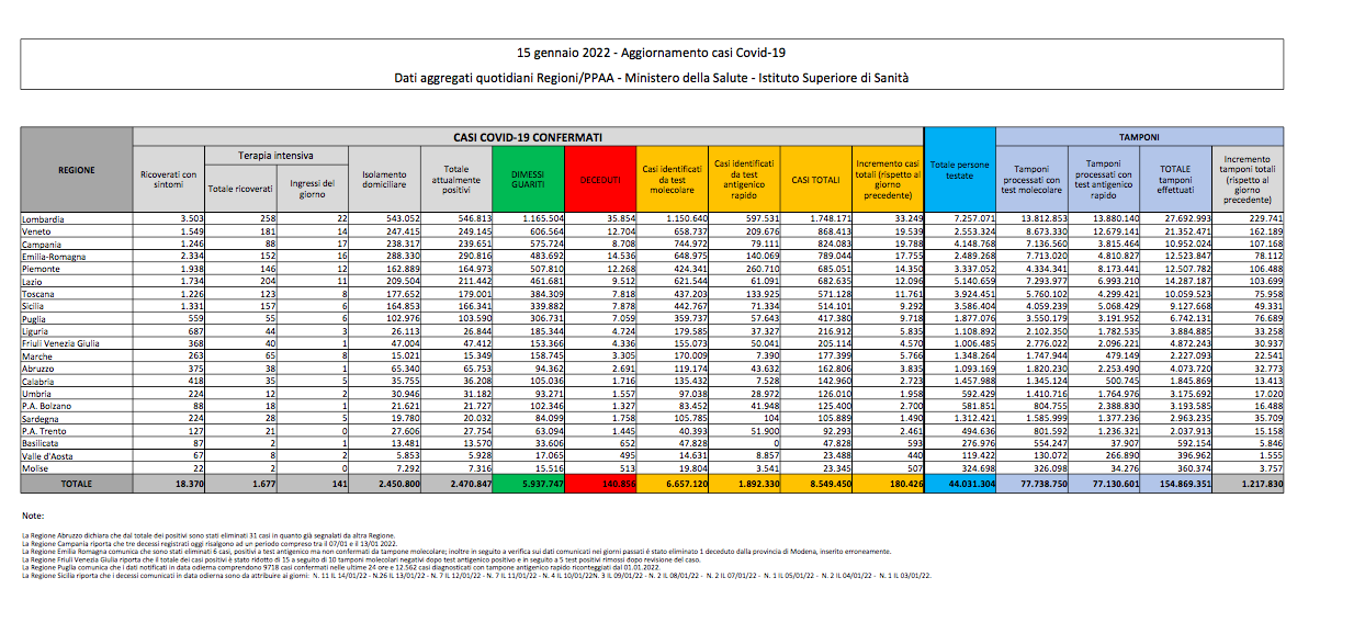 Covid, Italia: il bollettino di sabato 15 gennaio