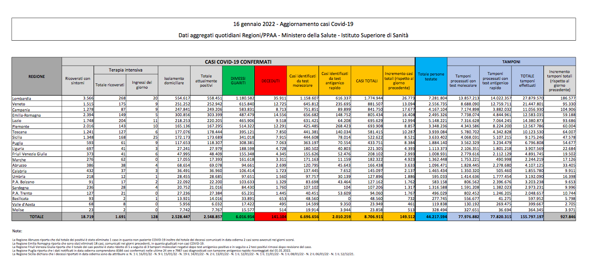 Sono 149.512 i nuovi casi di Coronavirus registrati su tutto il territorio nazionale, nell’arco delle ultime 24 ore (Ieri erano 180.426). La Lombardia, con 26.773 casi, risulta essere ancora una volta la regione maggiormente colpita dalla pandemia.