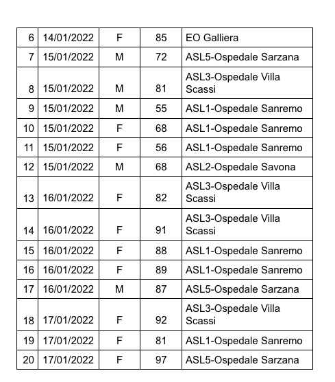 Venti i decessi sul territorio regionale, di cui 6 all’Ospedale di Sanremo.