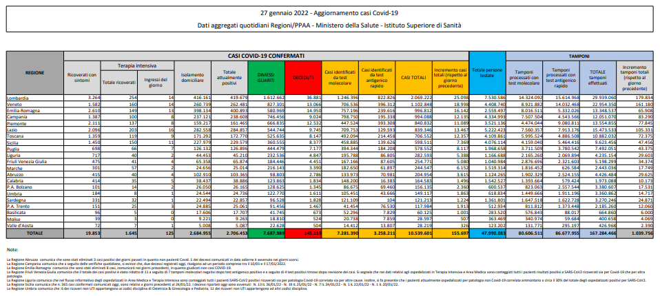 Covid, Italia: il bollettino di giovedì 27 gennaio