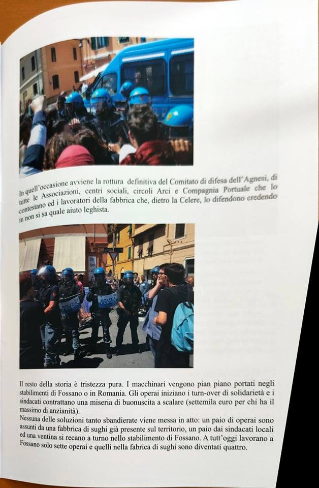 Skabò è una specie di fanzine, giornalino, con tutto quello che aveva rappresentato in quegli anni la lotta degli operai, dei sindacati e del Comitato per la difesa dell’Agnesi. All’intero ci sono contratti, fotografie, spiegazioni. Vengono definite anche le responsabilità, da parte del Sindaco, dei sindacati, di una parte degli operai. C’è anche una specie di morale in fondo, con il volantino ‘Colussi…oni’, già distribuito all’epoca, in cui ci si chiede se tutti già sapevano come sarebbe andata a finire la vicenda Agnesi, perché quel fronte mare era un’occasione troppo ghiotta per tutti, per la sinistra, la destra, i sindacati. Che l’Agnesi fosse già destinata a morire nella testa dei tanti politici che continuano, ora come allora, a portare avanti i propri interessi”.