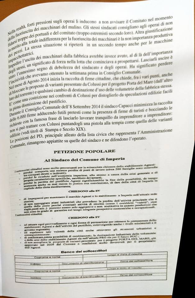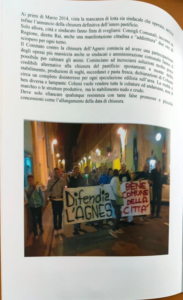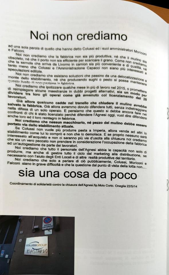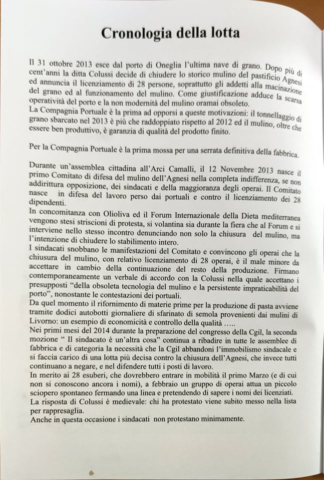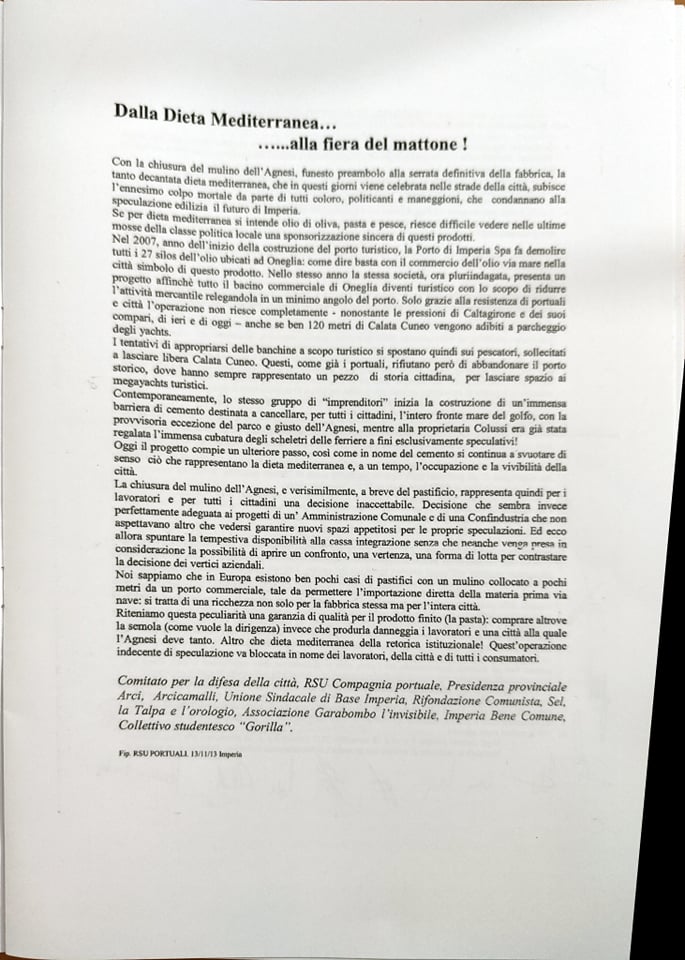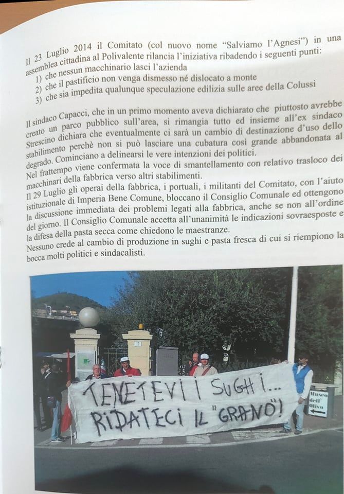 “Abbiamo ritenuto importante a sei anni dalla chiusura dell’Agnesi ripercorrere la storia di quegli ultimi due o tre anni, dal 2013 al 2015, 17 dicembre, giorno della chiusura. Lo abbiamo fatto per riportare in luce tutto quello che è avvenuto. Perché in questo momento? Perché sta ripartendo la discussione su quello che sarà il futuro dell’ex stabilimento Agnesi. Cominciano a circolare i rendering del progetto di abbattimento dell’ex fabbrica con l’uso dell’avamporto come parcheggio di grossi yacht, oltre ad alberghi e speculazioni. Abbiamo inoltre voluto tracciare un percorso storico di questi anni e ci riproponiamo il quesito che già allora ci proponevamo: una città può vivere solo di turismo? Una città come Imperia può azzerare quelle che sono le poche industrie alimentari che sono rimaste? Noi pensiamo proprio di no, perché pensiamo che il turismo crea del lavoro stagionale e in più, come dimostrato dalla pandemia, non si può pensare a una città che viva solo di quello. In tutte le altre città d’Italia, anche quelle turistiche, si aggiunge un tessuto industriale, agricolo, che non fa diventare le città delle piccole vetrine.