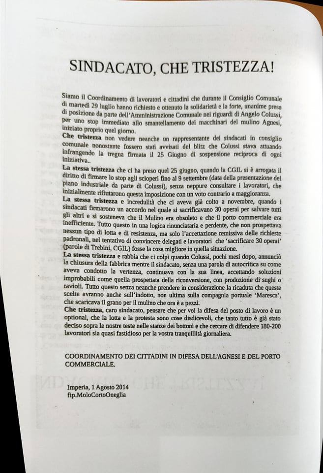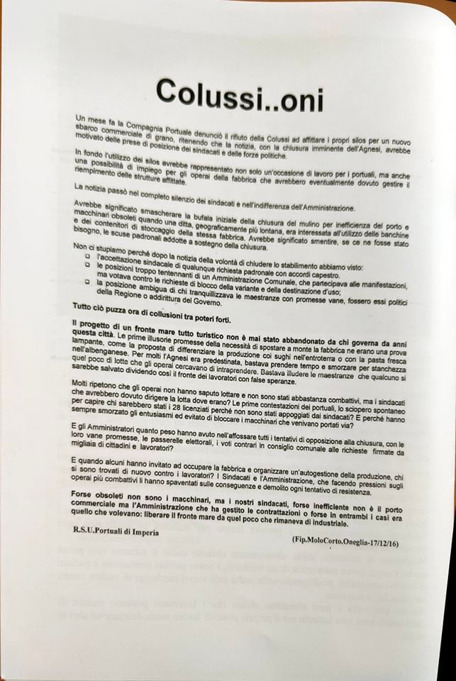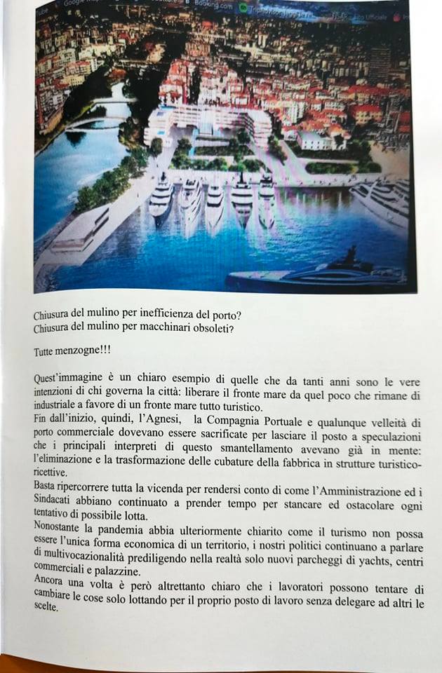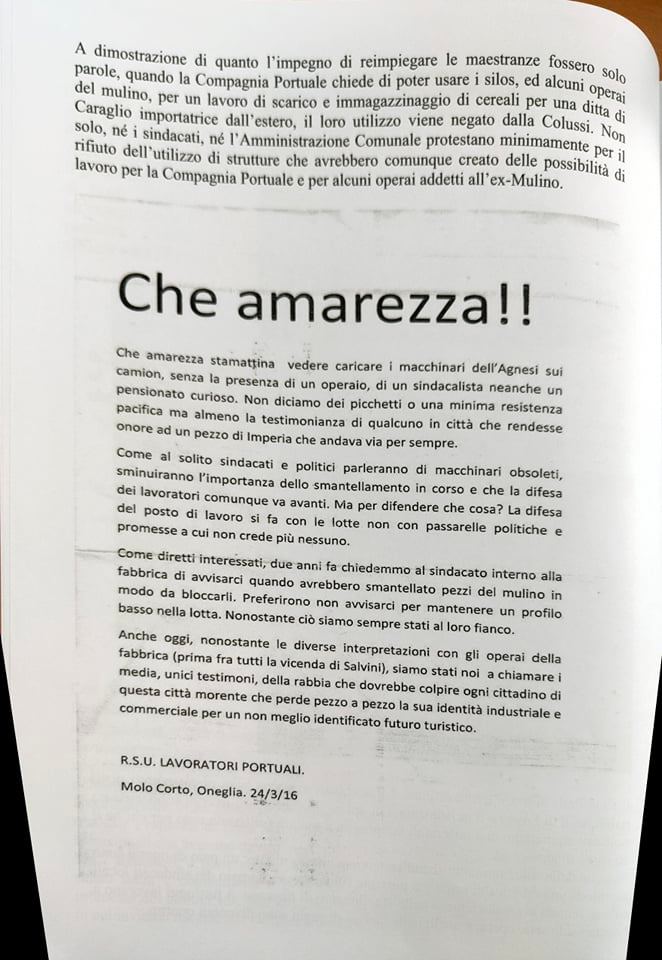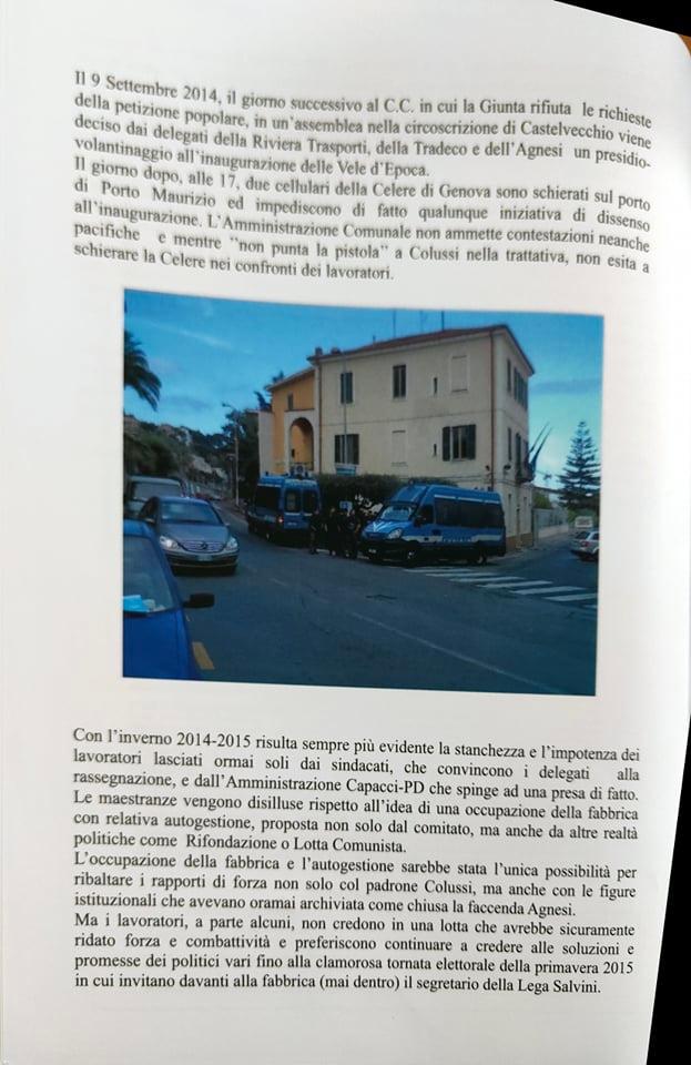 “Abbiamo ritenuto importante a sei anni dalla chiusura dell’Agnesi ripercorrere la storia di quegli ultimi due o tre anni, dal 2013 al 2015, 17 dicembre, giorno della chiusura. Lo abbiamo fatto per riportare in luce tutto quello che è avvenuto. Perché in questo momento? Perché sta ripartendo la discussione su quello che sarà il futuro dell’ex stabilimento Agnesi. Cominciano a circolare i rendering del progetto di abbattimento dell’ex fabbrica con l’uso dell’avamporto come parcheggio di grossi yacht, oltre ad alberghi e speculazioni. Abbiamo inoltre voluto tracciare un percorso storico di questi anni e ci riproponiamo il quesito che già allora ci proponevamo: una città può vivere solo di turismo? Una città come Imperia può azzerare quelle che sono le poche industrie alimentari che sono rimaste? Noi pensiamo proprio di no, perché pensiamo che il turismo crea del lavoro stagionale e in più, come dimostrato dalla pandemia, non si può pensare a una città che viva solo di quello. In tutte le altre città d’Italia, anche quelle turistiche, si aggiunge un tessuto industriale, agricolo, che non fa diventare le città delle piccole vetrine.