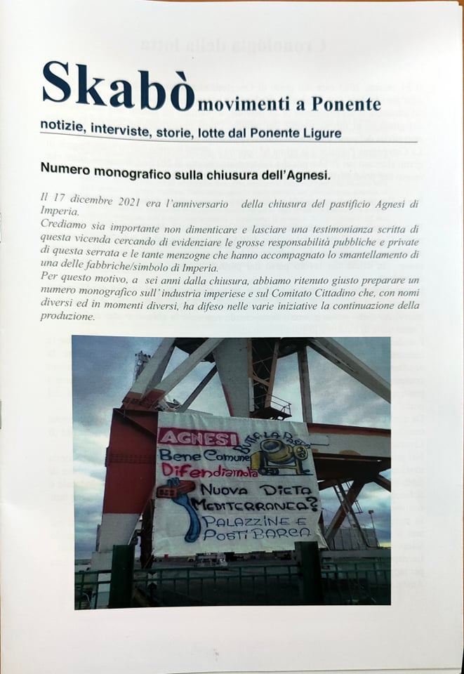 Oggi, sabato 29 gennaio, alle ore 19, al Circolo Arci Camalli di Imperia, si terrà un incontro per presentare la rivista “Skabò” dedicata alla chiusura dell’Agnesi. Al centro dell’incontro non solo le lotte per salvare la fabbrica, ma anche un dibattito sulle responsabilità della politica, dei sindacati e degli stessi operai.