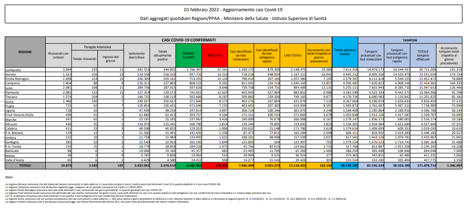 Covid, Italia: il bollettino di martedì 1 febbraio