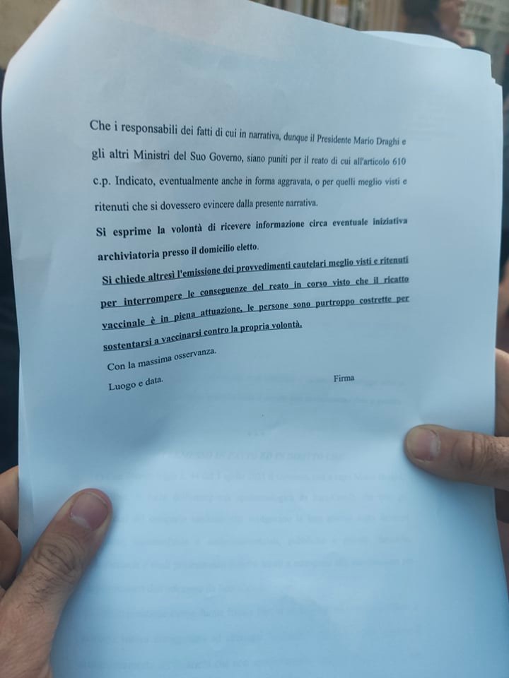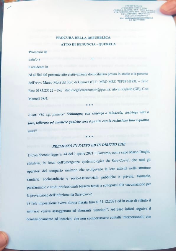 Sono state depositate oggi pomeriggio, presso il Comando provinciale dei Carabinieri di Imperia, in viale Matteotti, le denunce contro il Governo Draghi e l’obbligo vaccinale.