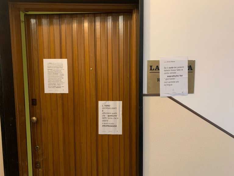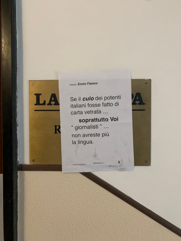 Alcuni cartelli con frasi ingiuriose nei confronti dei giornalisti sono stati affissi sulla porta di ingresso della redazione imperiese che ospita La Stampa e Il Secolo XIX, in via Alfieri.