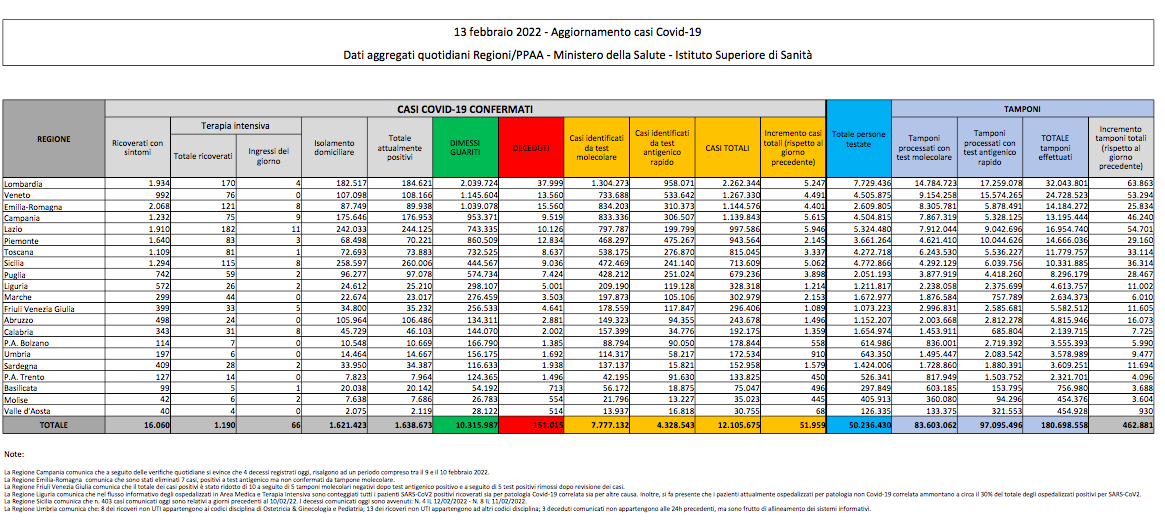 Covid, Italia: il bollettino di domenica 13 febbraio