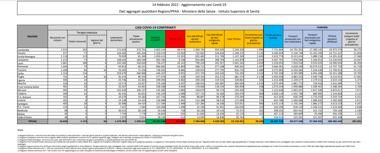 Covid, Italia: il bollettino di lunedì 14 febbraio