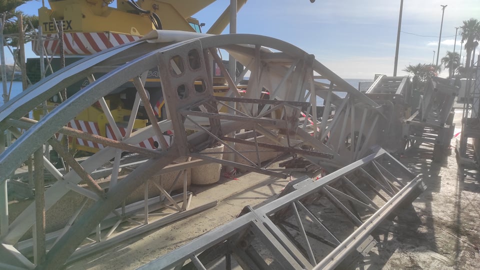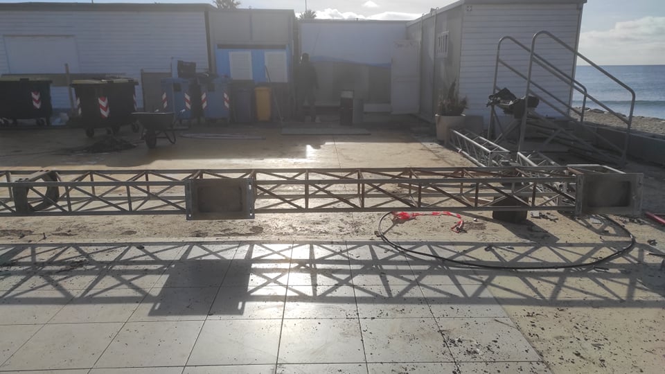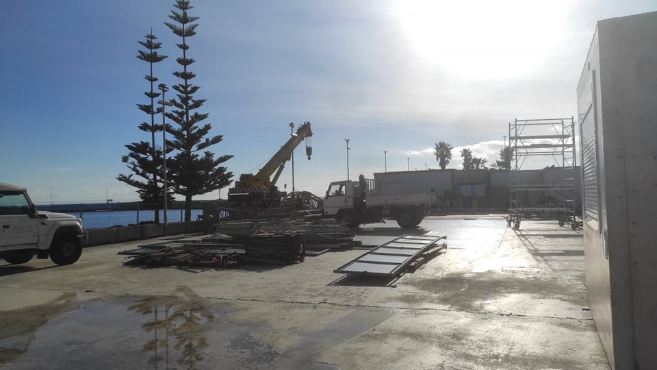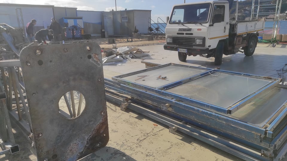 Operai al lavoro sul Molo delle Tartarughe, a Diano Marina, per smontare il palco delle manifestazioni. La struttura, presente da oltre 15 anni, non risulta più idonea con le prescrizioni stabilite dalla Regione Liguria.