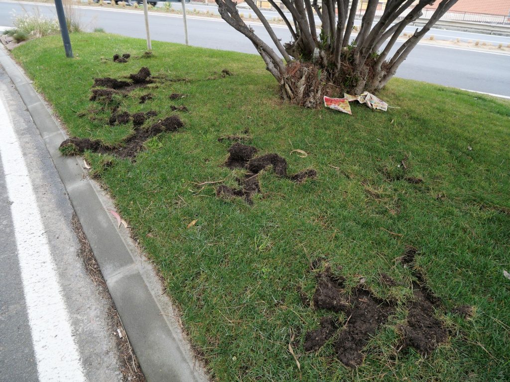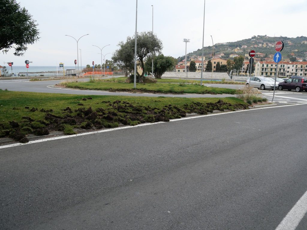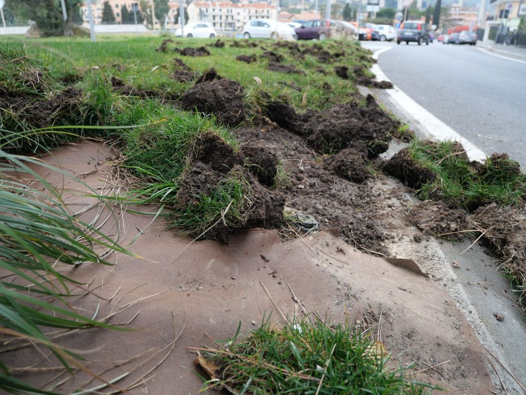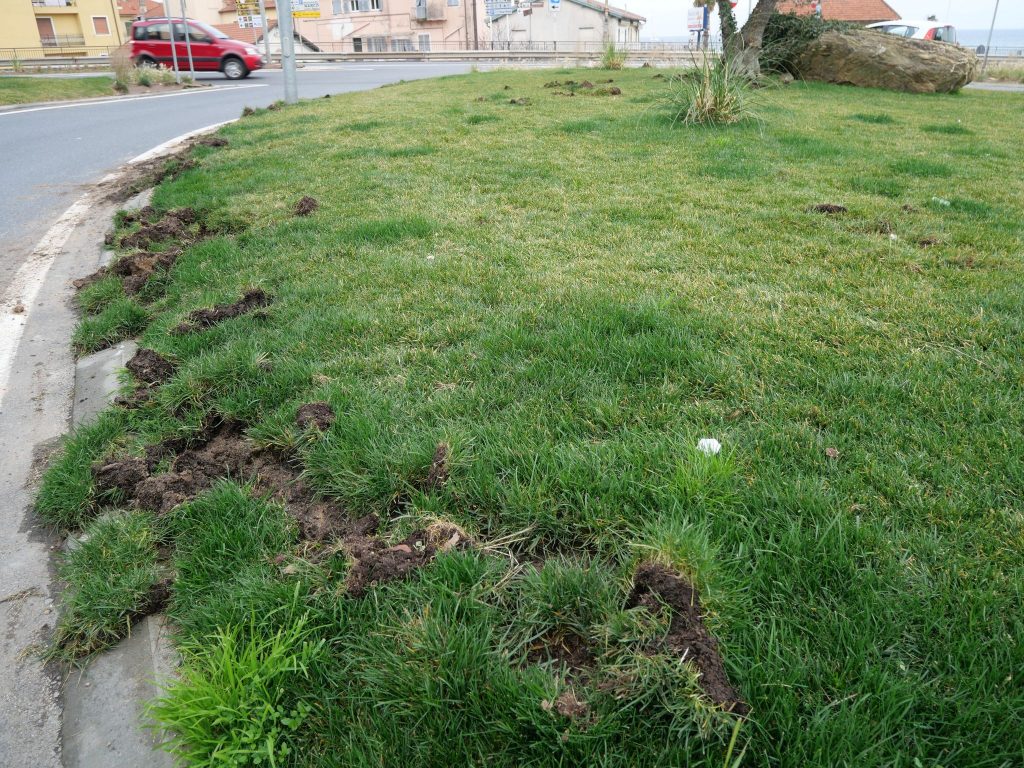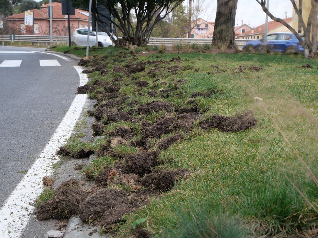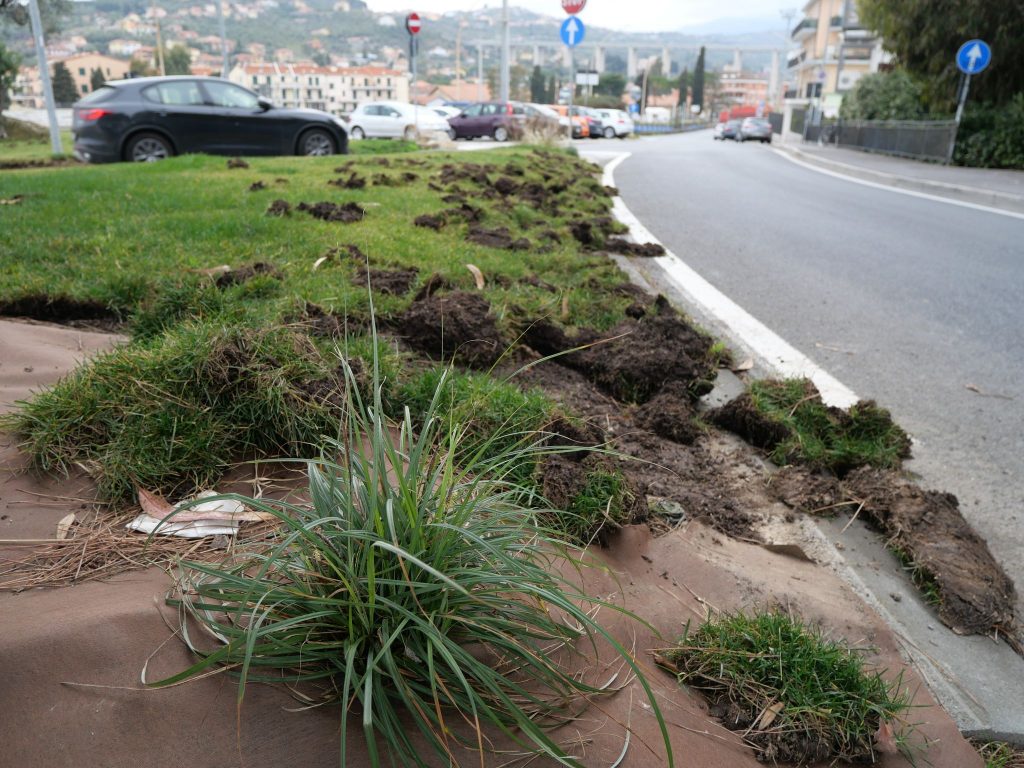 Le aiuole di via Littardi, alla porta di Ponente di Imperia, sono state devastate dai cinghiali. I danni sono ingenti e riguardano soprattutto il manto erboso, che gli ungulati hanno sollevato alla ricerca di cibo.