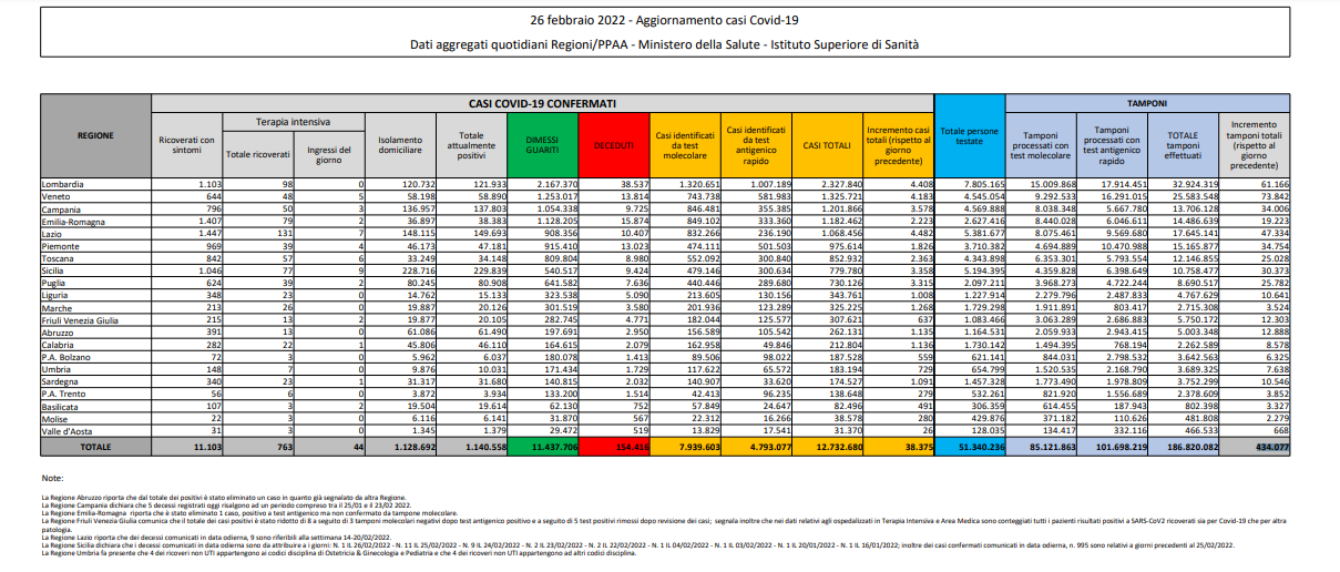Covid, Italia: il bollettino del 26 febbraio