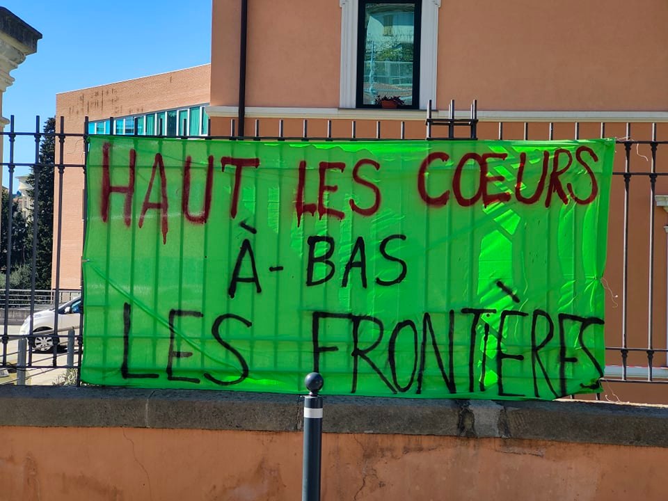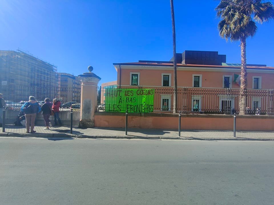 Davanti al Tribunale erano presenti alcuni attivisti che hanno affisso all’ingresso di Palazzo di Giustizia uno striscione sul quale campeggiava la scritta, in lingua francese, “Haut le coeurs a-bas le frontieres” (“In alto i cuori, abbasso le frontiere“), dedicato all’attivista transalpina Teresa Maffeis, scomparsa poche settimane fa.