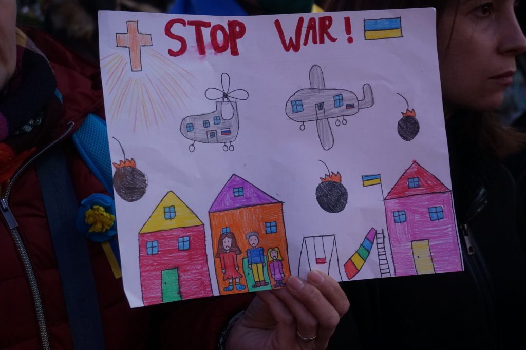 Caterina, ucraina sposata con un italiano, vive da anni a Cervo e mostra un disegno della guerra fatto da sua figlia. E dice: “A mia figlia io dico tutte le cose come stanno, ma le dico di avere fede. Lei infatti ha disegnato anche una croce con i raggi che illumina le case bombardate. La fede nel Signore ci rende forti. Noi come popolo non abbiamo mai occupato la terra di altri popoli e per questo ci sentiamo dalla per te della verità. Questa storia che racconta Putin, che in Ucraina la gente è sottomessa non è vera. Nessun russo, ebreo, rumeno o tartaro è sottomesso. Anzi, ci sono scuole per tutte le minoranze con la lingue di insegnamento per loro. Io sono nata in Crimea e quando è crollata l’Unione Sovietica ero piccola e solo allora mia mamma era riuscita a organizzare una classe per insegnare l’ucraino. Noi non abbiamo mai offeso o maltrattato nessuno. Siamo convinti che dalla nostra parte c’è la verità e che quindi il Signore ci sostiene”.