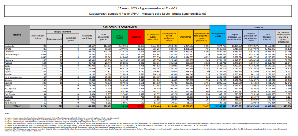 Sono 425.638 i tamponi effettuati, 27.703 in meno di ieri, con un tasso di positività dell’12,5%. 156 i morti registrati in tutta Italia.