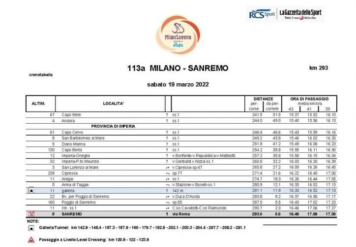 - Bivio per Poggio di Sanremo: 16.37/17.17
