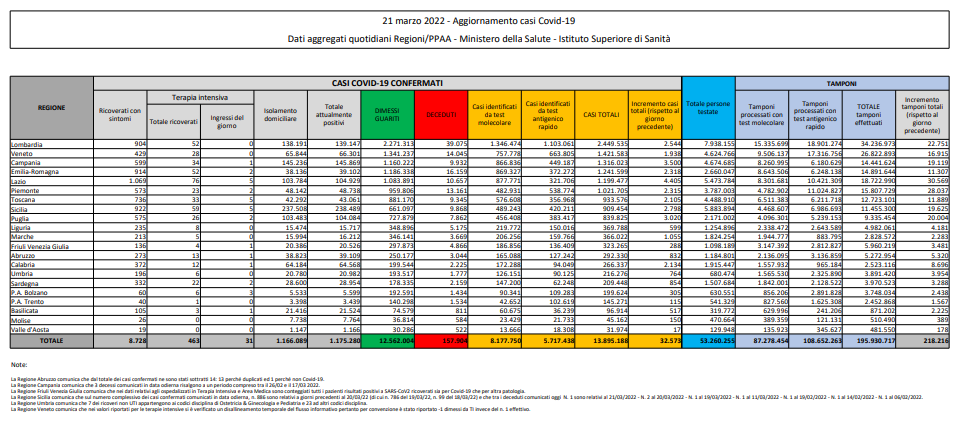 Covid, Italia: il bollettino di lunedì 21 marzo