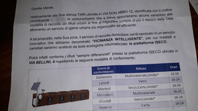 “Da 50 anni portiamo la spazzatura dietro il grattacielo e adesso dovremo portarla in via Bellini, questa è vicinanza intelligente?”. Queste le parole di alcuni residenti del grattacielo di Oneglia, in via Don Abbo 12, che, dopo aver ricevuto a casa le tessere con le informazioni sul nuovo servizio di raccolta rifiuti tramite ISECO (Isole Ecologiche automatizzate), hanno scoperto che la loro piattaforma non sarà dietro il grattacielo, ma quella in via Bellini, vicino alla vecchia stazione.