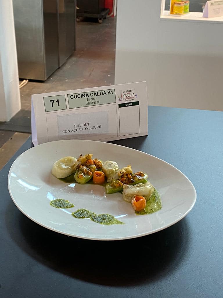 “Ho scelto un piatto particolare e l’ho chiamato ‘Halibut con accento ligure’. L’halibut è un pesce nordico, della Groenlandia. Ho scelto di impiattarlo con i sapori della mia terra, la Liguria, a cui tanto sono legato. Ho utilizzato le trombette di Albenga, i carciofi di Albenga, fritti con la farina di ceci, salse a base di pesto e marò di fave. Tutti prodotti provienti da produzioni locali. Anche l’impiattamento ricordava le arcature della nostra regione. Il mio obiettivo era quello di far si che sia l’aspetto visivo che quello gustativo riportassero alla mia Liguria che ho voluto rappresentare a un evento nazionale. I giudici hanno molto apprezzato”.