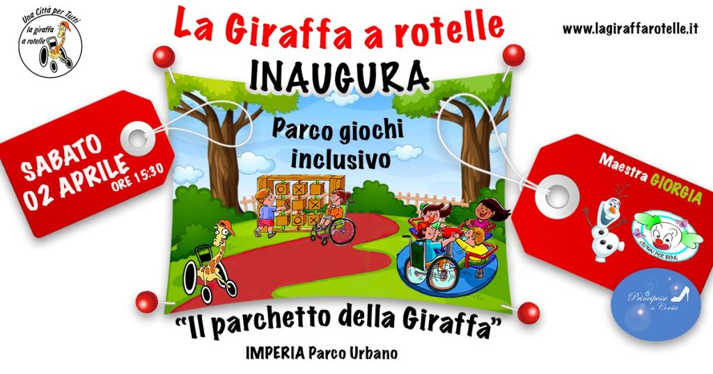 Sabato 2 aprile, alle ore 15.30, al Parco Urbano a Imperia, si terrà l’inaugurazione del “Parchetto della Giraffa”. Per far divertire tutti i bambini, ci saranno i “Clown per bene” la dolcezza dei libretti letti dalla “Maestra Giorgia“, il mondo delle favole con le” Principesse in Corsia” e il simpaticissimo “Olaf“. Alla fine anche merenda e zucchero filato.