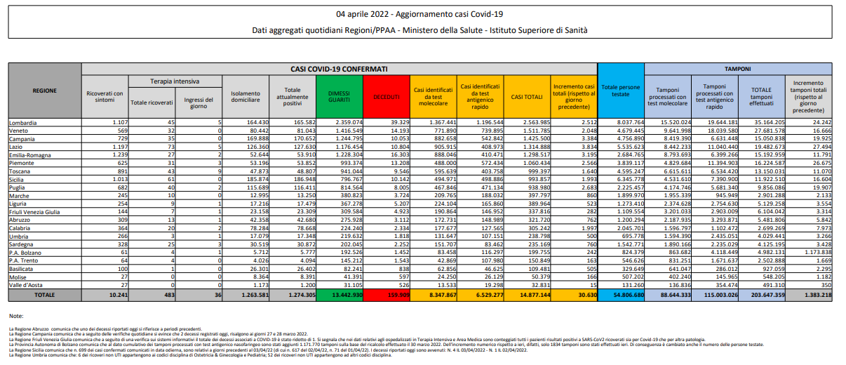 Covid, Italia: il bollettino di lunedì 4 aprile