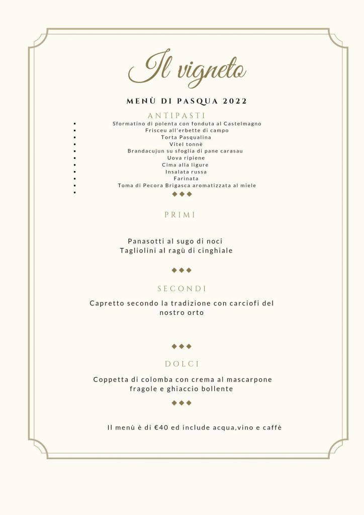 Tipica cucina ligure in tipico casolare in pietra in mezzo al verde, agli orti, ai giochi , alla spensieratezza.Il menù che il Vigneto propone in questa Pasqua 2022 è un tuffo tra i sapori ponentini capace di restituire al palato i gusti, i profumi e la storia della terra… si, quella terra coltivata con dedizione e fatica nel rispetto della stagionalità.