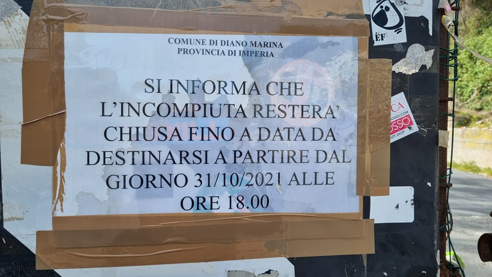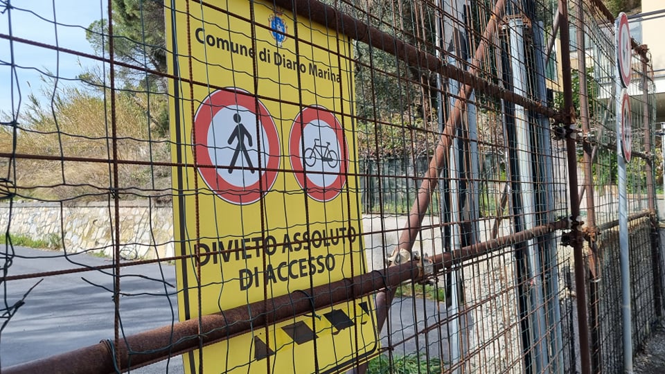 L’Incompiuta, ovvero la strada ciclopedonale che costeggia Capo Berta a ridosso del mare, unendo Diano Marina a Imperia, è chiusa dallo scorso ottobre 2021 a causa delle frane che avevano reso impraticabile il percorso.