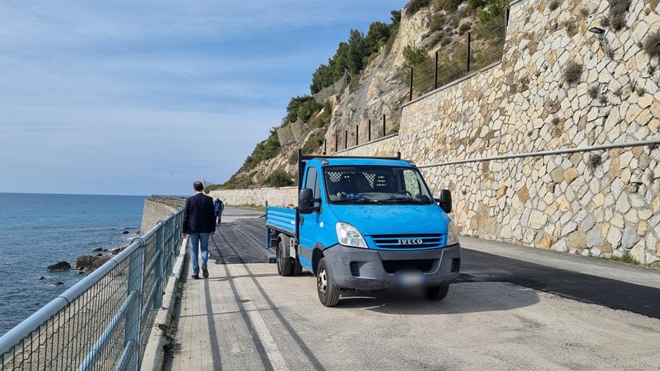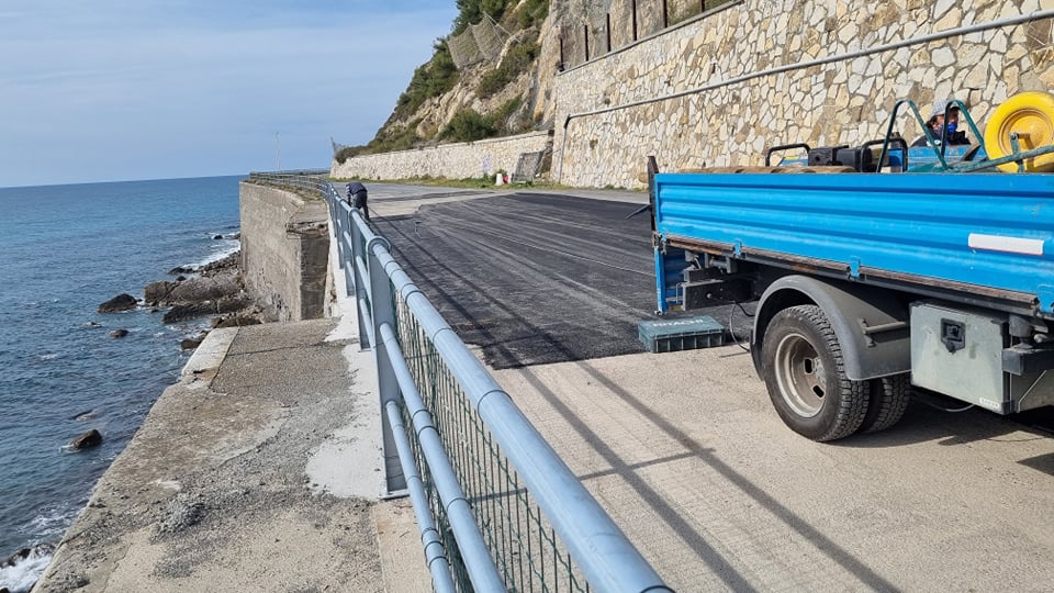 “Finalmente è una giornata positiva. Con questo sole riusciamo anche a chiudere le ultime asfaltature di questa strada che negli anni scorsi è crollata incredibilmente a valle sul mare insieme al muraglione che la sorreggeva.