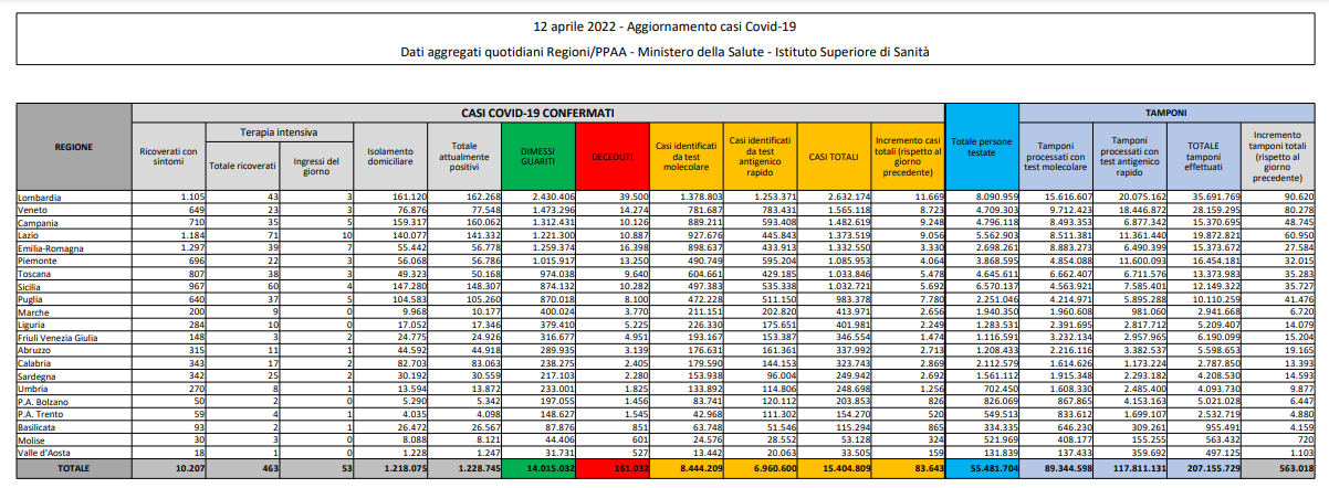 Covid, Italia: il bollettino di martedì 12 aprile