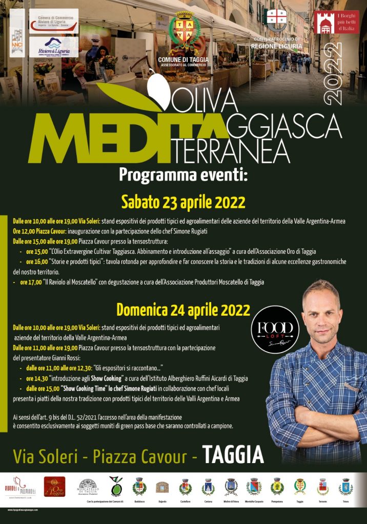 Meditaggiasca sarà ancora una volta una grande piazza ambientata in un centro storico straordinario che ospiterà produttori, gli chef del territorio con le antiche ricette, ma anche profumi e colori dell’entroterra. L’organizzazione è firmata dal Comune di Taggia, Assessorato al Commercio, e dall’Azienda Speciale della Camera di Commercio Riviere di Liguria con il patrocinio di Anci e Borghi più Belli d’Italia.