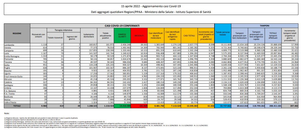 Sono 61.555 i nuovi casi di Coronavirus registrati su tutto il territorio nazionale, nell’arco delle ultime 24 ore (ieri 64.951). La Lombardia, con 8.098 casi, risulta essere la regione maggiormente colpita dalla pandemia.