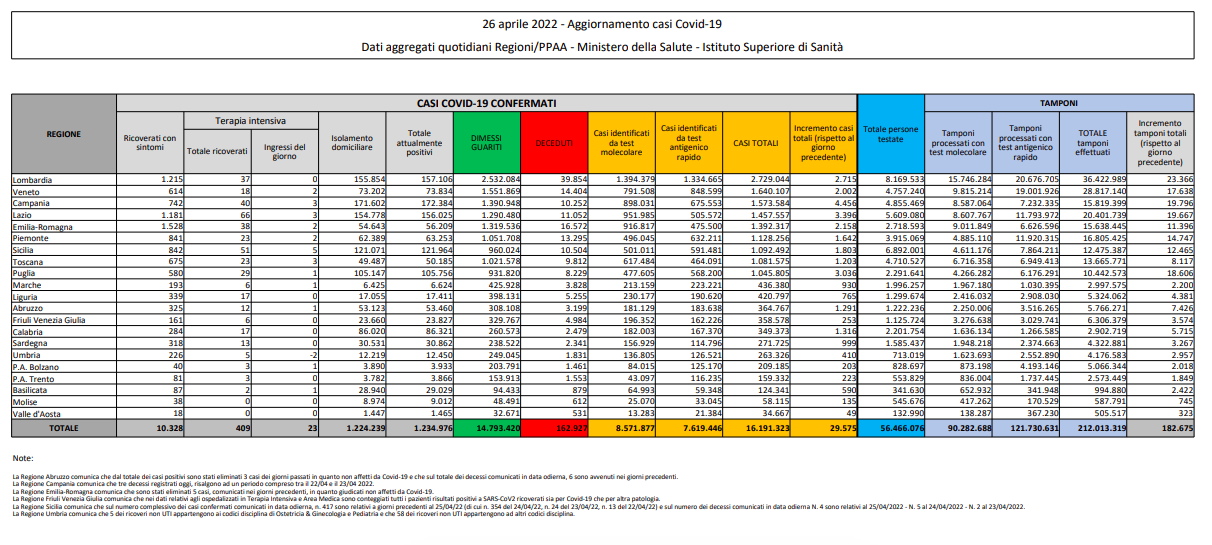Covid, Italia: il bollettino del 26 aprile