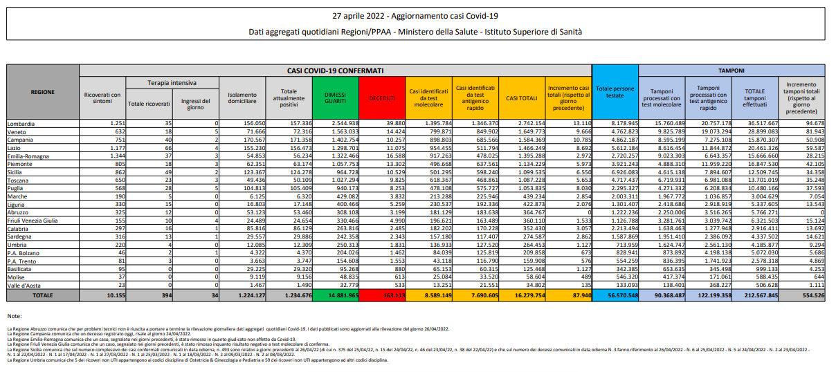 Covid, Italia: il bollettino di mercoledì 27 aprile