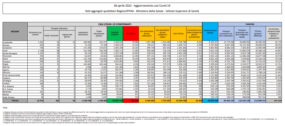 Covid, Italia: il bollettino di giovedì 28 aprile
