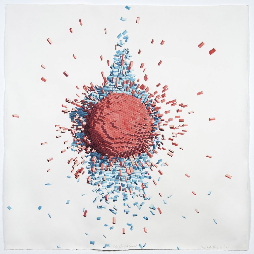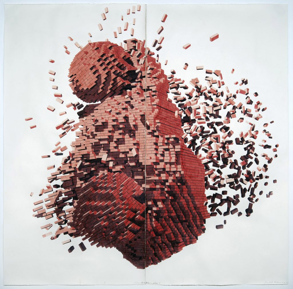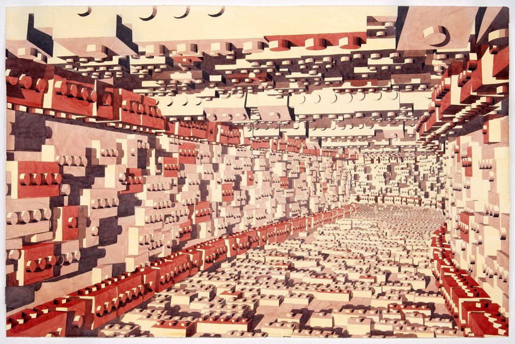 Con una intuizione magica, ha utilizzato la forma del Lego, ripetuto all’infinito, acquerellata con una tecnica sopraffina, per dare vita ad immagini di forte e coinvolgente impatto visivo.