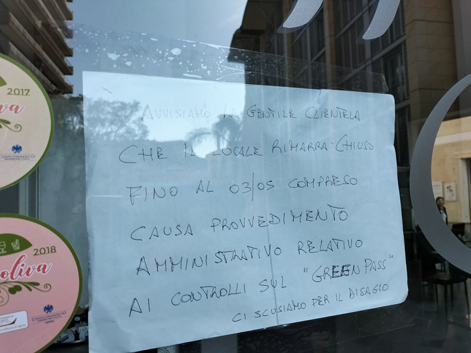 “Il locale rimarrà chiuso fino al 3 maggio compreso causa provvedimento amministrativo relativo ai controlli sul green pass”. Si legge sul cartello affisso sulla vetrina del locale.