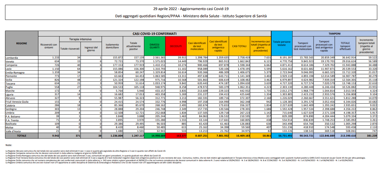 Covid, Italia: il bollettino di venerdì 29 aprile