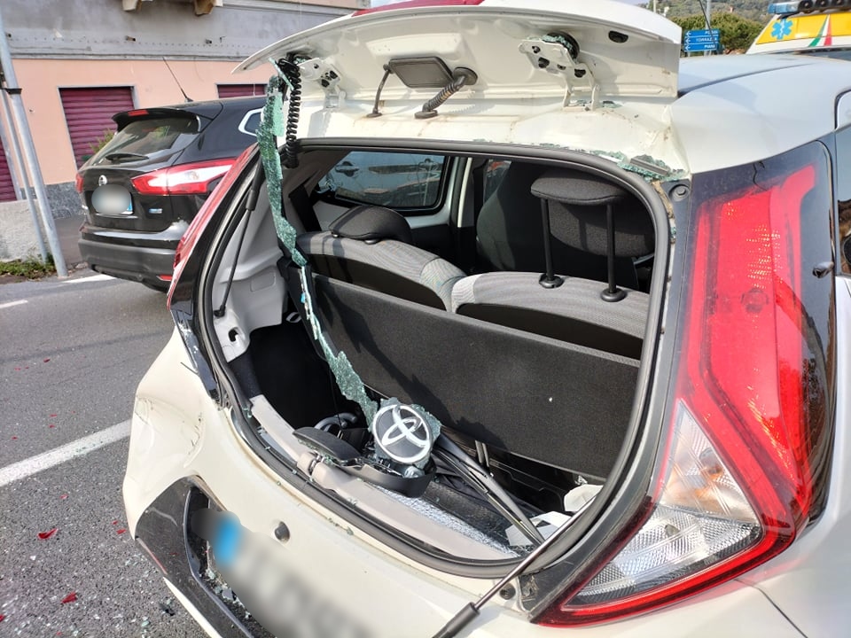 L’impatto ha danneggiato la parte posteriore dell’auto e ha mandato in frantumi il lunotto. La conducente dell’auto, 51enne, in stato di choc per l’accaduto, ma senza apparenti lesioni, è stata trasportata in codice verde al Pronto Soccorso di Imperia dalla Croce Verde di Arma di Taggia per accertamenti.